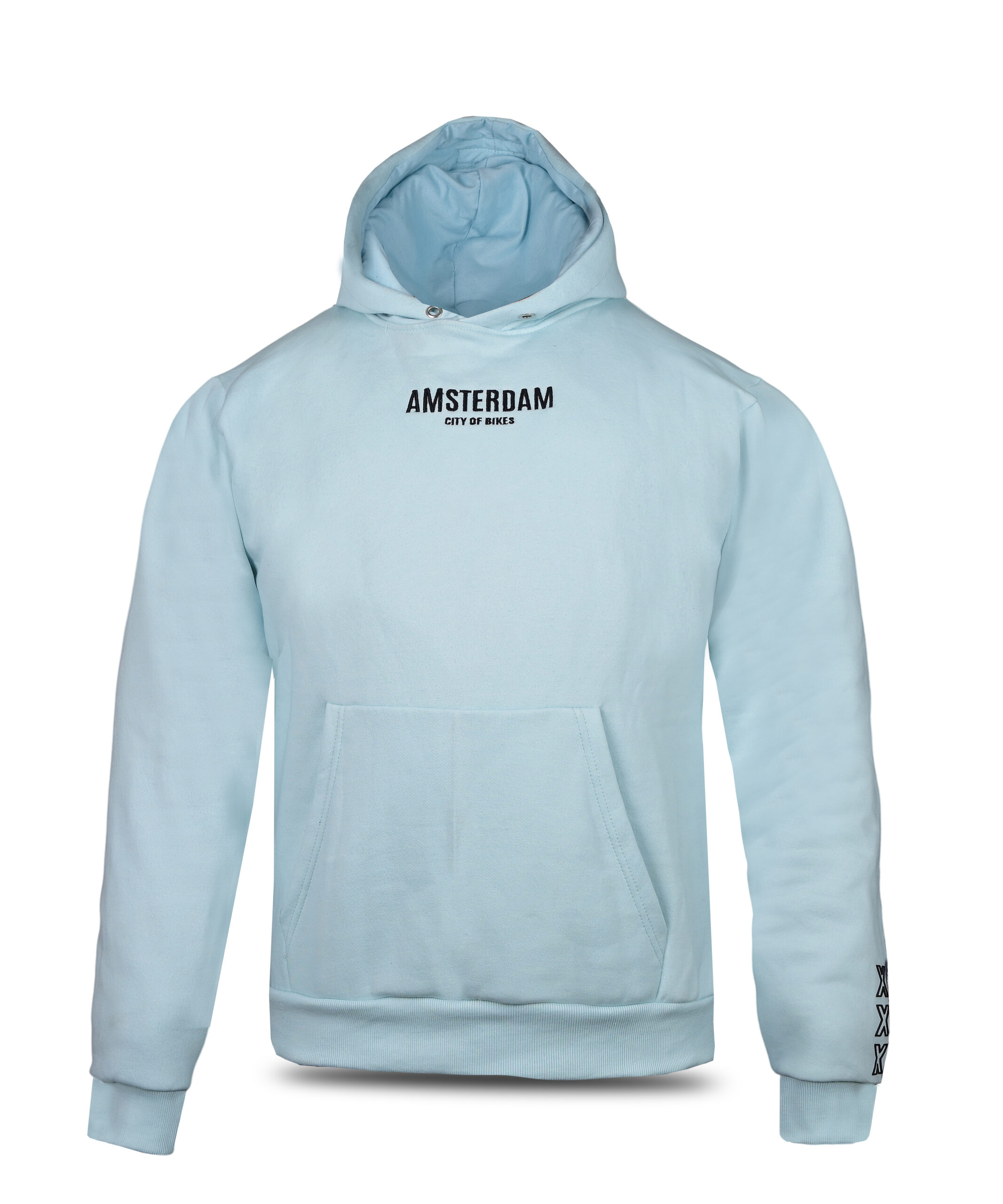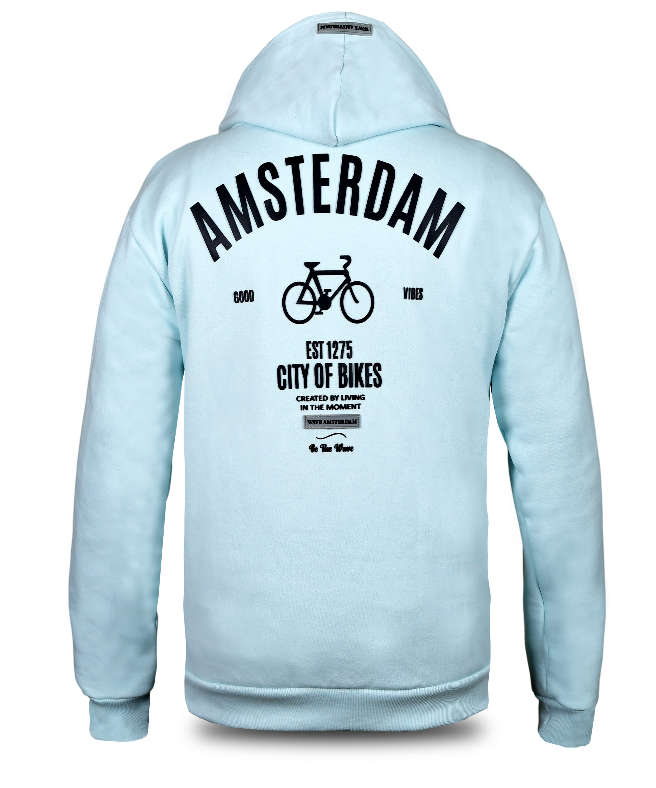 Celebrate the cycling capital of the world with this high-quality sky blue hoodie. The back features a bold “Amsterdam” arch and a sleek bicycle graphic, complemented by the “City of Bikes” and “Good Vibes” slogans. Designed for ultimate comfort, it includes a cozy fleece-lined hood with a unique “Wave Amsterdam” brand patch. The heavy-duty ribbing at the cuffs and hem ensures a perfect, lasting fit for everyday urban wear.