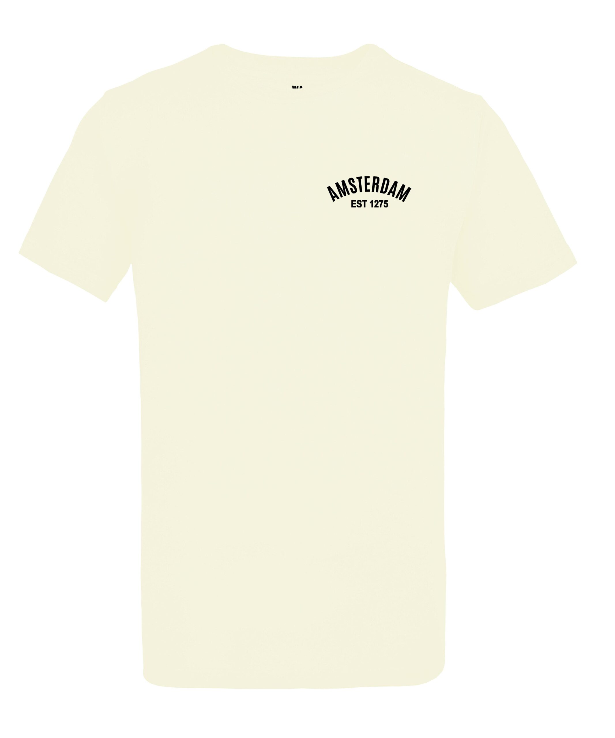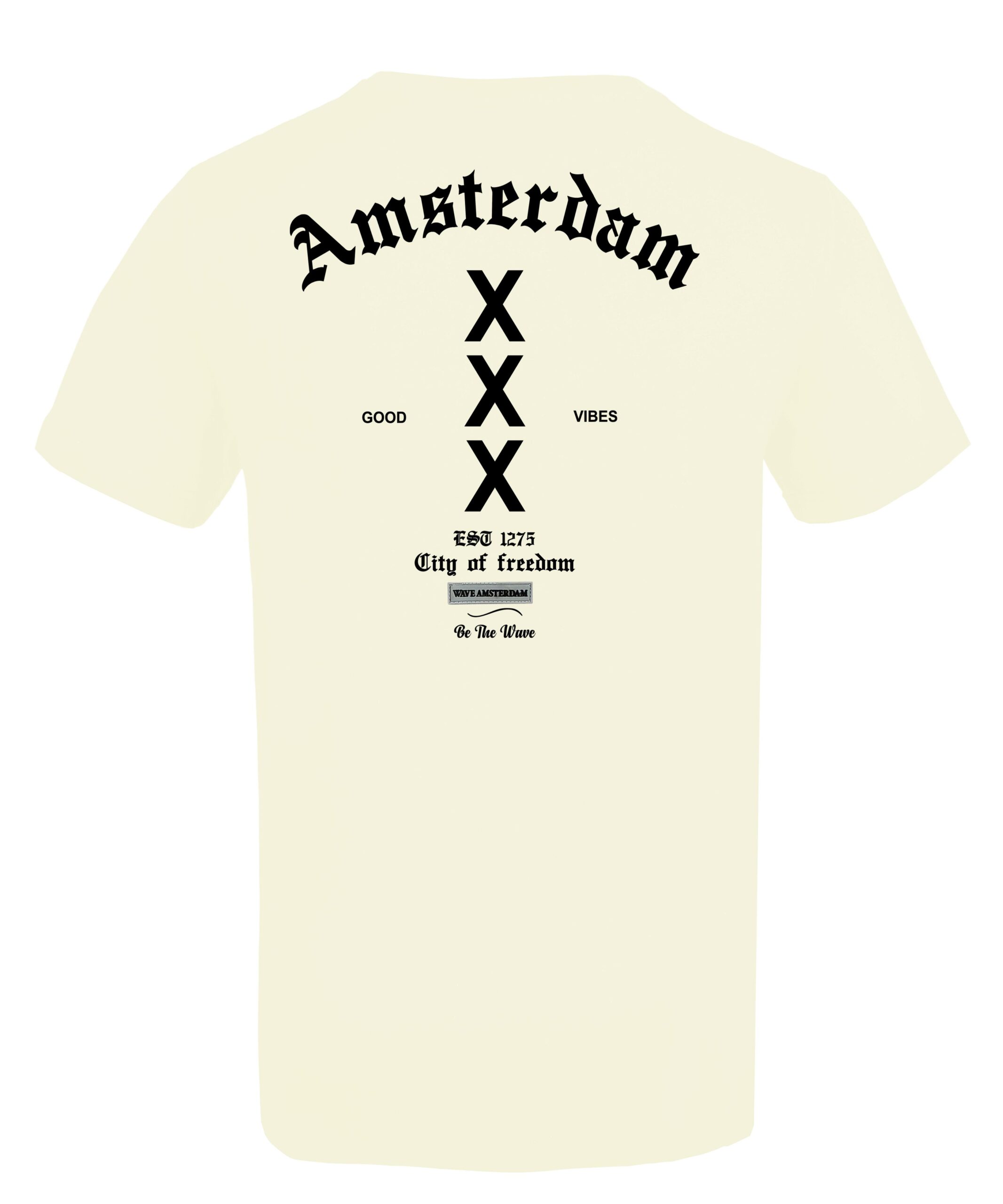 A classic urban essential in a versatile cream hue. This T-shirt features a high-contrast black Gothic “Amsterdam” arch across the shoulders and the iconic triple-X (XXX) vertical graphic. With “City of Freedom” and “Good Vibes” branding, this piece captures the spirit of the Netherlands’ most famous city. Made from high-quality, soft-touch fabric with a detailed “Be The Wave” signature at the base.