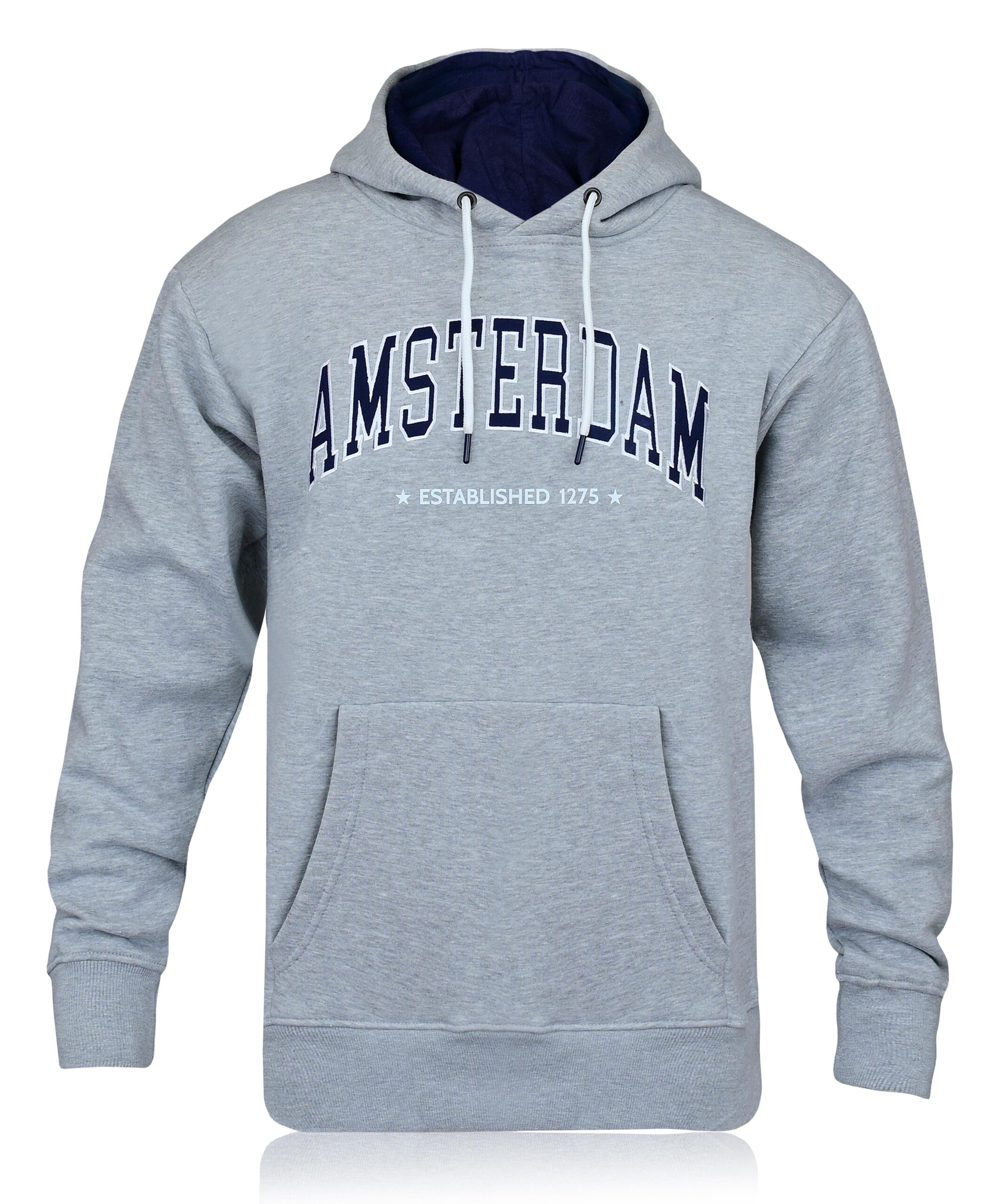 A classic athletic-inspired staple for any wardrobe. This light grey heather hoodie features a bold, navy blue arched “AMSTERDAM” applique across the chest, underscored by “Established 1275” branding. It is designed with a high-contrast navy blue inner hood lining, white adjustable drawstrings, and a spacious front kangaroo pocket for maximum utility and style.